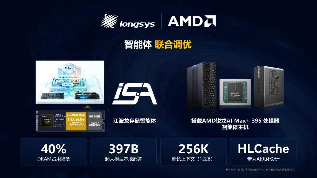 江波龙与AMD的深度协同,更让这一技术组合的实力得到充分验证。双方基于锐龙AI Max+ 395处理器的智能体主机开展联合调优,成功实现397B超大模型的本地部署,在256K超长上下文(122B)场景下,将DRAM占用降低近40%,为超大模型本地化高效部署与规模化应用提供了可落地的创新方案。作为AMD的长期合作伙伴,此次联合调优更是双方生态协同的进一步深化,未来将持续发挥各自技术优势,推动端侧AI存储生态的完善。