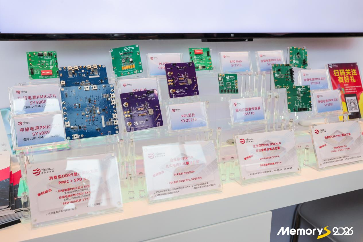 同时,企业级SSD PLP及大电流POL解决方案首发分容检测功能,支持超薄盘片,配备4*12bit高精度ADC,电流检测精度达±5mA,电容检测精度达+5%,支持多电容三分组故障检测,兼容现有设计无需改动PCB,代表产品包括PLP芯片SYQ5899、POL芯片SYQ5255及SYQ5256,为企业级SSD提供稳定可靠的电源保障。